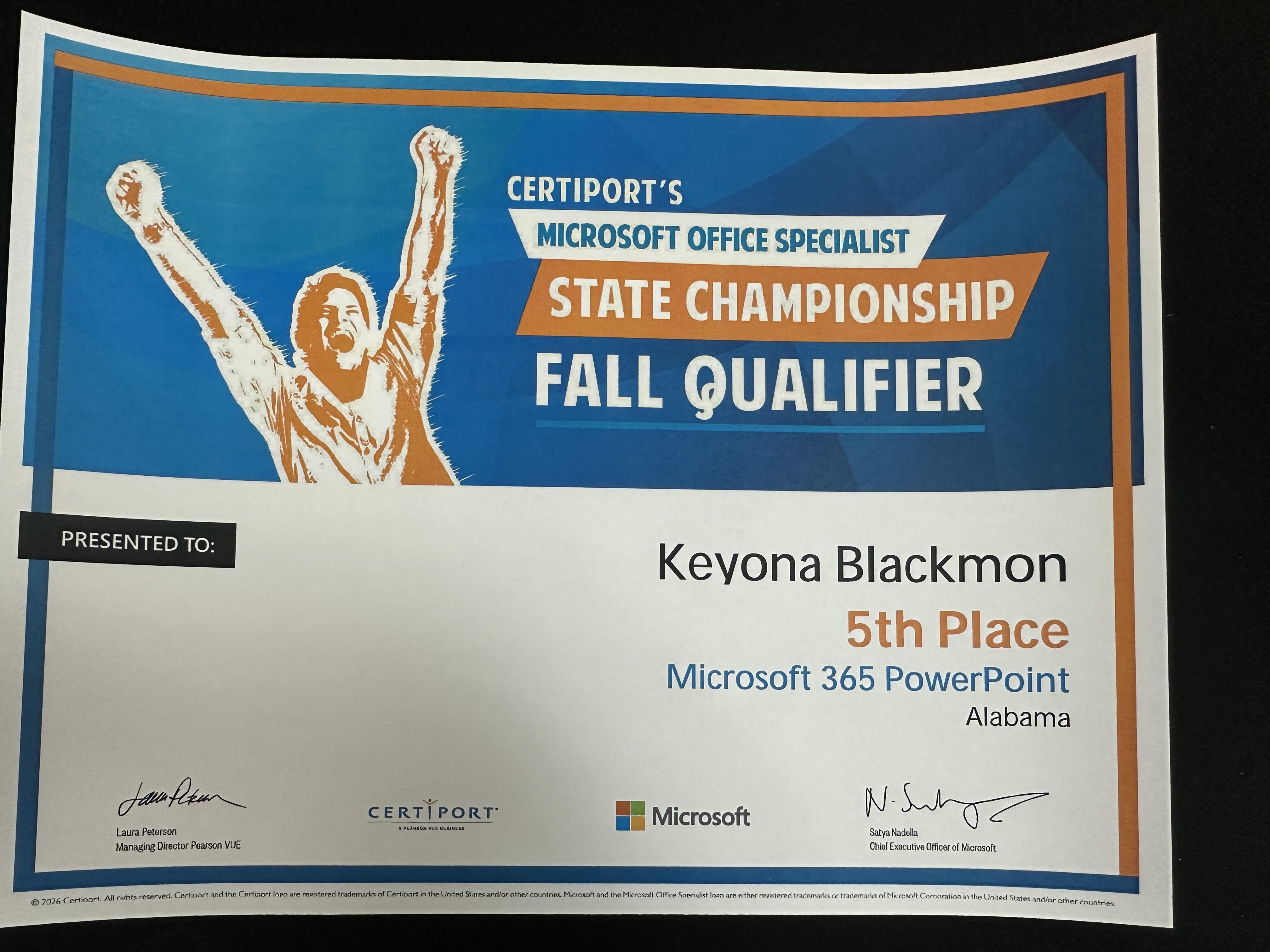 We have a student who has placed in the top 5 in the Microsoft state competition. Keyon Blackmon placed 5th in the Microsoft Office 365 PowerPoint certification test competition. Congratulations ...